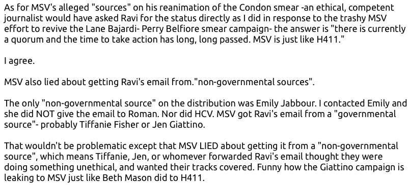 MSV as written in the original exclusive story on Friday stated the Ravi Bhalla email, a public document was obtained from non-governmental sources. It did not come from the Giattino campaign.