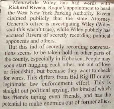 | The weekend Al Sullivan political column points to covert taping of conversations in Hoboken. |